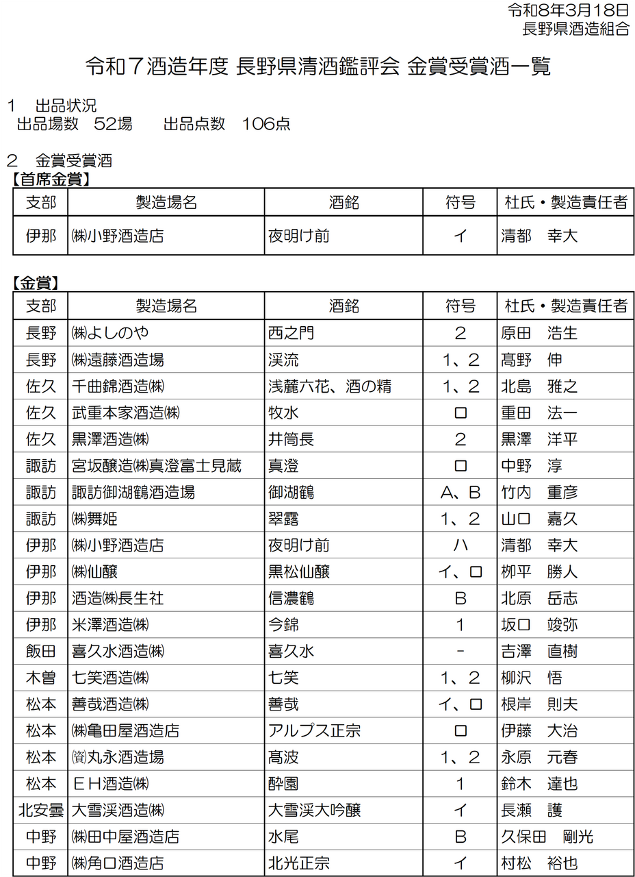 2026.03.19 令和7酒造年度長野県清酒鑑評会 金賞受賞酒発表!! お知らせ 令和8年3月17日に行われました、令和7酒造年度長野県清酒鑑評会 金賞受賞酒一覧 この記事をシェアする シェア ツイート